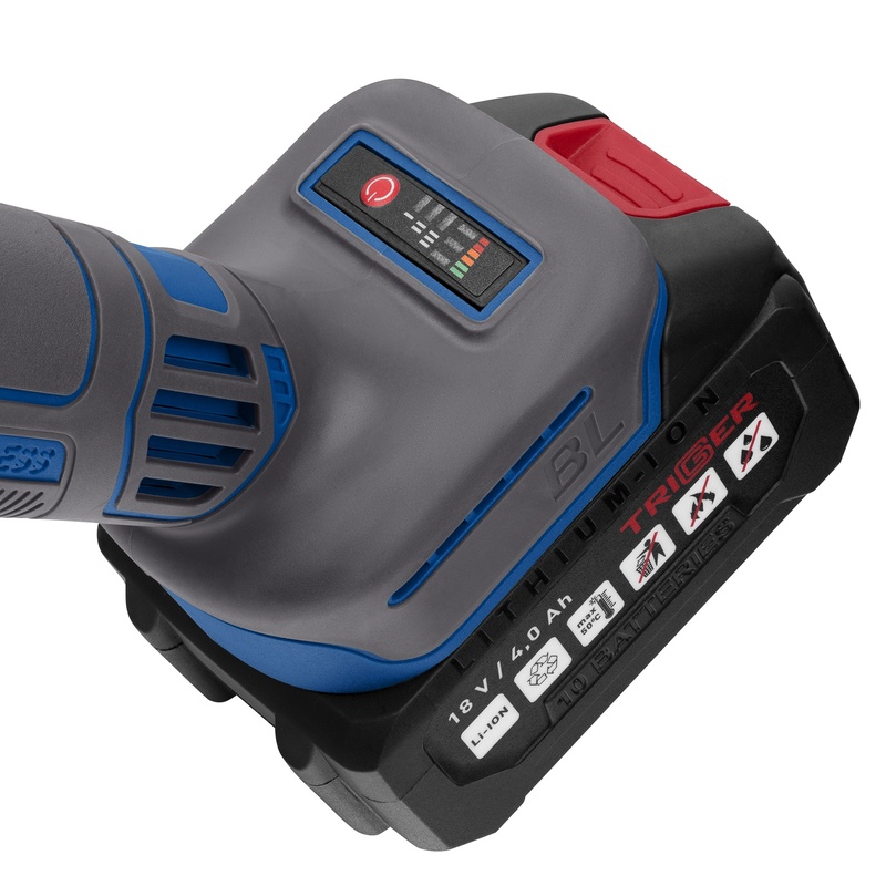 Trigger 20123 – бесщеточная угловая шлифовальная машина с единой аккумуляторной платформой. Благодаря многоступенчатой электронной регулировке частоты вращения УШМ используется как для резки, так и для зачистных или шлифовальных работ. Корпус выполнен из нейлона, редуктор - из алюминиевого сплава.